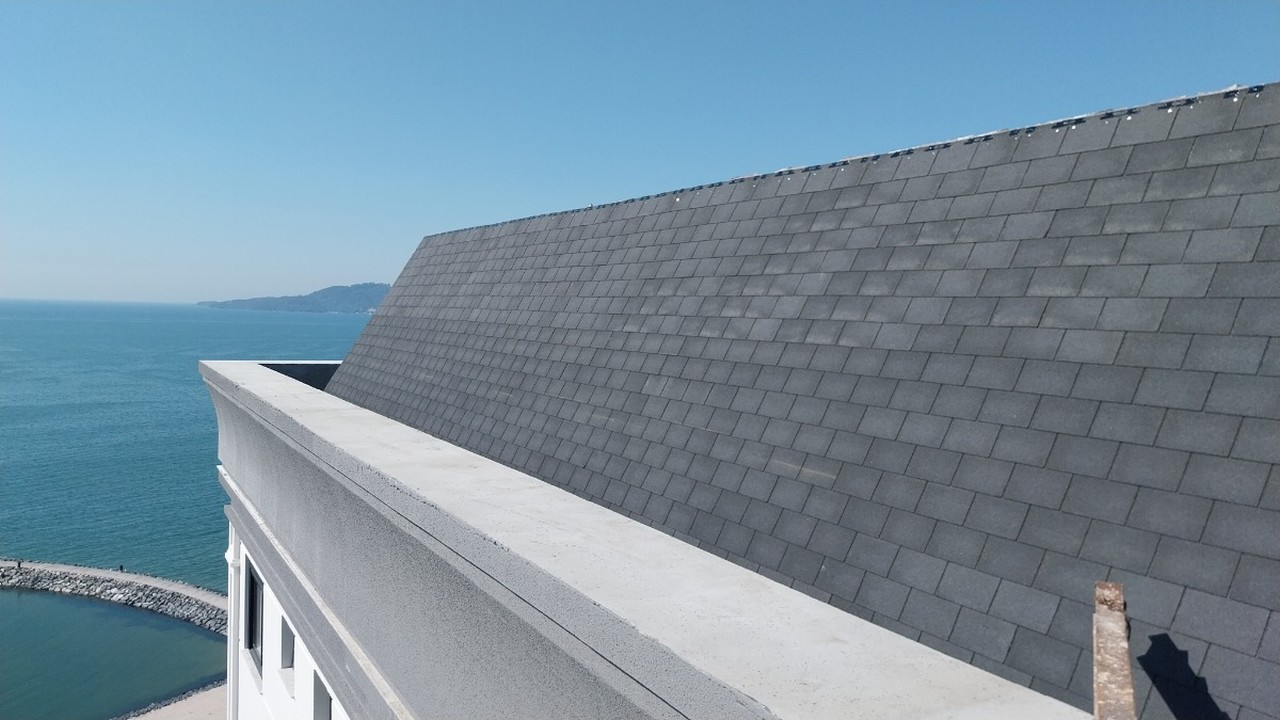 Piscina adulto com vista para o mar, banco e acesso para PNE